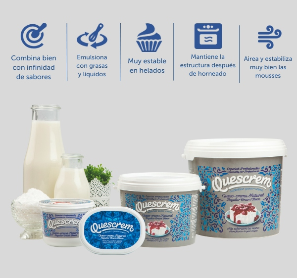 Quescrem regular es un queso crema suave y cremoso especialmente pensado para profesionales. Su sabor natural, fresco, láctico y equilibrado ofrece gran versatilidad para multitud de aplicaciones culinarias.
