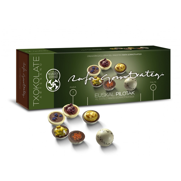 Elaboramos artesanalmente estos delicados bombones, con forma de media pelota, en homenaje a la pelota vasca. Rellenos de originales sabores: té matcha, fruta de la pasión, menta, pimiento d'Espelette, ruby y avellana. Una cuidada selección de sabores para disfrutar del saber hacer de Rafa Gorrotxategi. 12 BOMBONES.