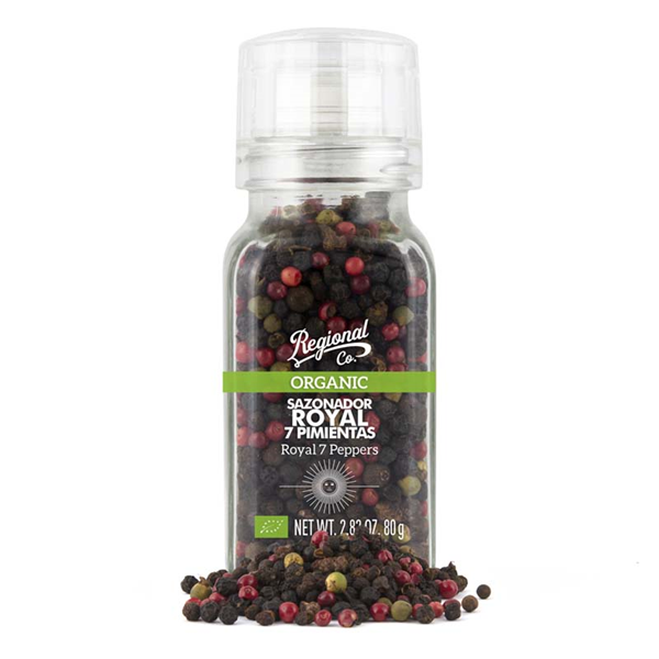 Sabemos que te fascina la pimienta y que te gusta probar cosas nuevas. Lo normal es mezclar 5 pimientas pero en Regional Co. ¡nos hemos atrevido a mezclar 7!Son la pimienta negra, la larga, la verde liofilizada, la rosa, la de Sichuan, la de Jamaica y la de Cubeba. Porque en Regional Co. siempre queremos dar más. Esta atrevida combinación de 7 pimientas ha provocado que los que la prueben queden fascinados por su aroma y su sabor que combinan impecablemente. Una oleada intensa se mezcla en tu paladar para hacerte disfrutar de las mejores pimientas del mundo y todas en un mismo momento. Cada una de ellas aporta su cualidad más exquisita, su toque más sabroso…Si por separado ya son potentes, juntas, serán una explosión de sabor en tu plato.Imagina esa mezcla trascendente desde el plato hasta tu paladar provocando en tus sentidos un deleite ¡al que no vas a querer renunciar!Esta expresión total de sabores combina con casi todo: guisos, pescados, carnes, pastas, cremas etc.Imagina ese suculento plato de pasta italiana ¿A qué te apetece darle el último toque final con las mejores pimientas y con un aroma eclipsante? Se te hace la boca agua…. lo sabemos.¿Y qué más te vas a llevar? Ya sabes que la pimienta tiene propiedades antiinflamatorias y terapéuticas, ¡imagínate 7 pimientas juntas!!!Será todo lo que necesitas en tu plato para que se convierta en esa especialidad picante y exquisita.