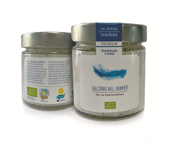 Sal de Fuerteventura Salinas del Carmen es una exclusiva sal marina gourmet de origen natural y color blanco brillante. De la pureza del agua de las Salinas del Carmen en Fuerteventura, se extrae una de las sales más bajas en cloruro de sodio del mercado y rica en oligoelementos (magnesio, zinc y calcio). Su sistema de extracción tradicional, está basado en su totalidad en principios artesanales majoreros.En la extracción de la Sal de Fuerteventura Salinas del Carmen no interviene ningún tipo de máquina, siendo un sistema totalmente artesanal que se desarrolla utilizando medios y recursos tradicionales. Esto hace que la Sal de Fuerteventura Salinas del Carmen tenga una producción limitada, convirtiéndola en un producto único, exclusivo y muy apreciado en el mercado gastronómico. Toda nuestra sal ha sido recientemente certificada como ecológica.