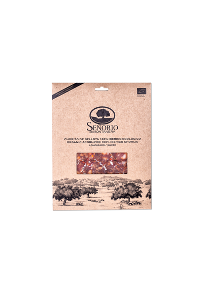 Disfruta del sabor del chorizo ecológico de bellota 100% ibérico de Señorío de Montanera en un práctico formato loncheado y envasado al vacío en sobres de 100 g, preparado para regalo en un sobre de cartón reciclado.