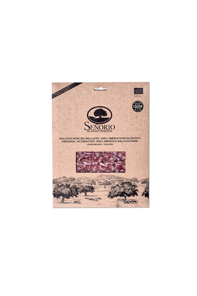 Disfruta del sabor del salchichón ecológico de bellota 100% ibérico de Señorío de Montanera en un práctico formato loncheado y envasado al vacío en sobres de 100 g, preparado para regalo en un sobre de cartón reciclado.