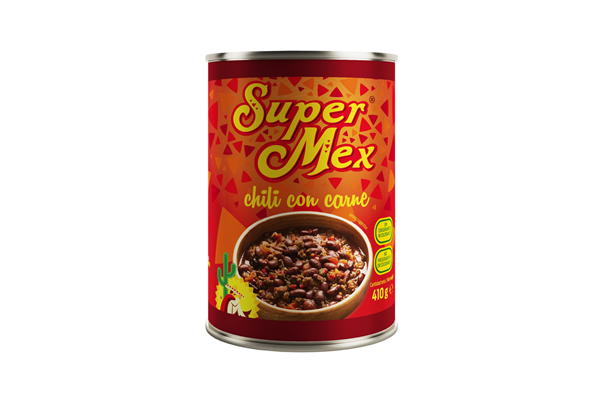 El chile con carne es un famoso plato de la cocina tex-mex, preparado a base de carne de vacuno y alubias rojas, mezclado con una salsa de tomate ligeramente picante. Es el complemento perfecto para acompañar con unos nachos, rellenar unos burritos o simplemente comerlo con arroz como plato principal. Super-Mex Foods ofrece una lata de 410 gr. llena de sabor y lista para consumir.