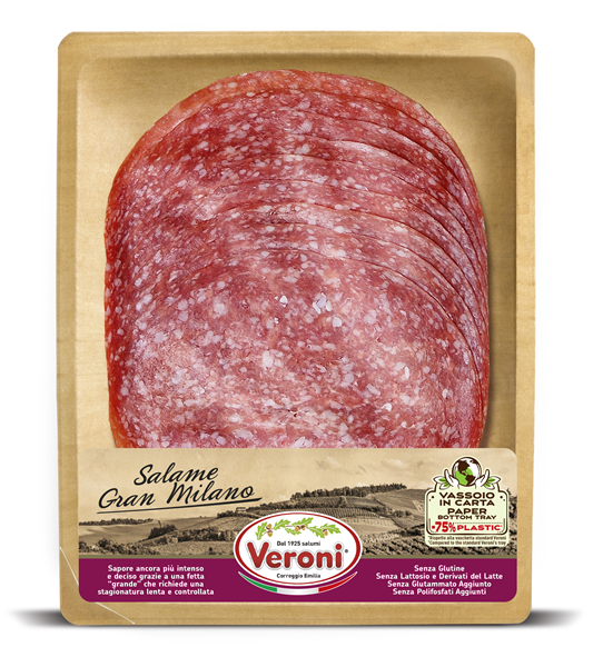 Salame Gran Milano, ideal para saborearlo al natural o para preparar recetas deliciosas. Lenta curación para un sabor más intenso. Loncha más grande y sabrosa (dos veces el tamaño del Salame Milano tradicional). Sin gluten, sin glutamato monosódico añadido, sin lactosa ni derivados de la leche, sin polifosfatos añadidos. Bandeja de papel certificado y reciclable, producida con un 75% menos de plástico en comparación con las bandejas tradicionales de Veroni.