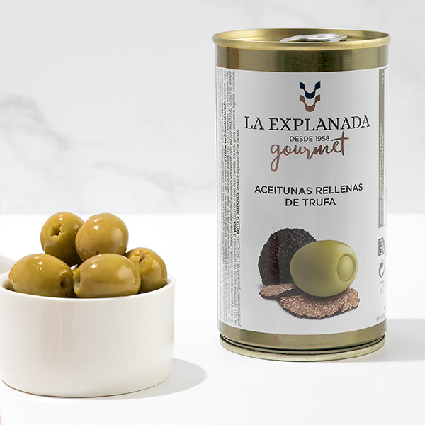 Aceitunas manzanilla y hojiblanca de la mejor calidad, de gran tamaño y rellenas de trufa