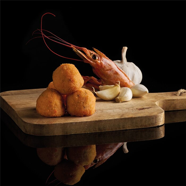 Croquetas gourmet de gambas al ajillo. Cremosas por dentro y crujientes por fuera. Ingredientes naturales 100%: mantequilla, leche y harina.
