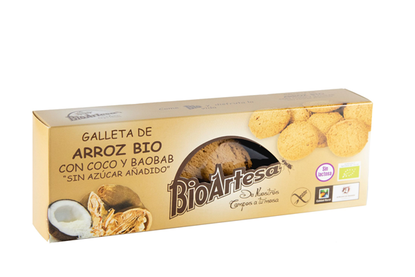 Ingredientes: harina de arroz, sirope de agave, grasas vegetal (coco y girasol), almidón de tapioca, baobab (3%), harina de coco, huevo, goma de guar, extracto de romero. Producto ecológico.