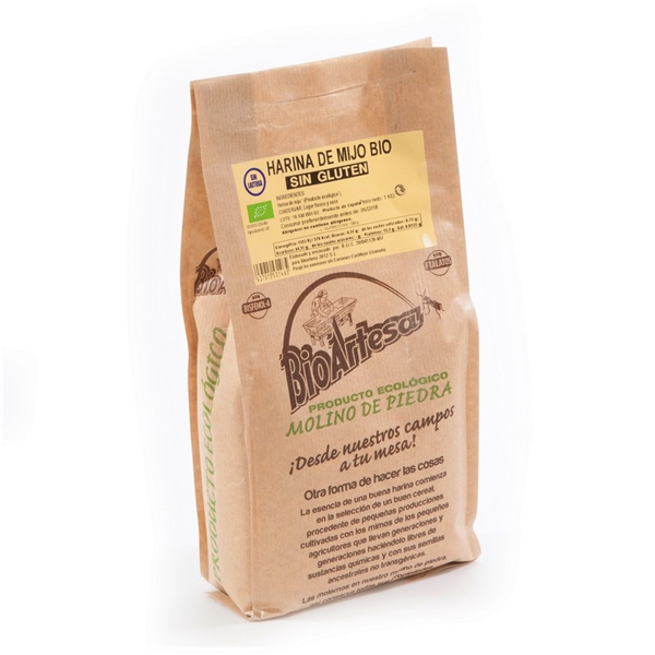 La harina de mijo se obtiene de la molienda del grano de mijo termotratado. Es una harina no panificable que se utiliza principalmente para enriquecer panes, masas de pastelería, entre otros. En cuanto a su valor nutricional, es rico en fibra, vitaminas y minerales. No contiene gluten por lo que es apta para personas celíacas e intolerantes. Sin conservantes. 100% ecológico.