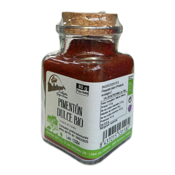 El pimentón dulce en polvo se obtiene de la trituración de pimiento secos. Es un condimento importante en la cocina española por su versatilidad así como por sus grandes beneficios para la salud. Esta especia se utiliza en guisos con legumbres, verduras, embutidos, pescado, patatas, entre otros.