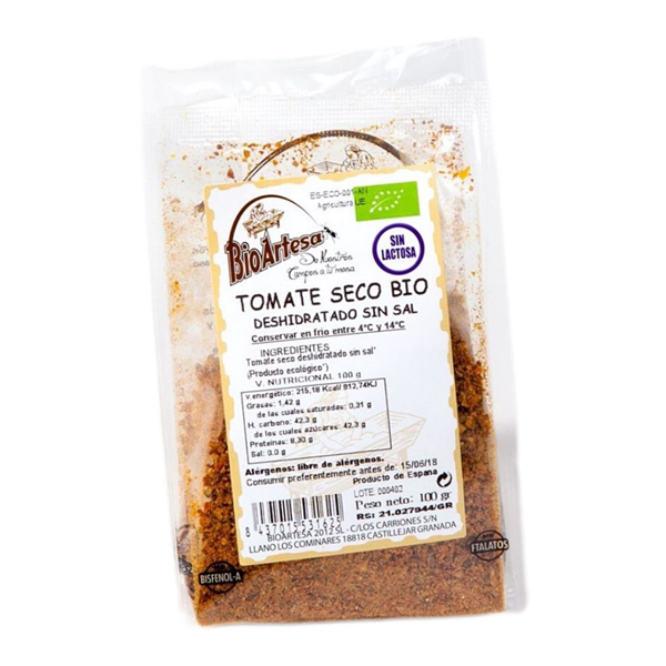 El tomate deshidratado es secado a temperatura constante para mantener sus nutrientes, luego se muele hasta conseguir una textura muy fina con una tonalidad roja de color y sabor típico del tomate. Ideal para usar como ingrediente en preparados alimenticios o decoración en ensaladas. De agricultura ecológica y nacional.