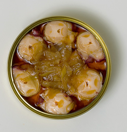 Medallones de pulpo gallego rigurosamente seleccionados. Su piel se retira a mano, con tijera y una a una. Se le añade aceite de oliva, pimentón y cebolla.