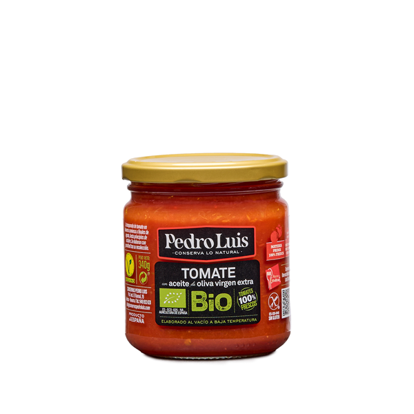 Este tomate se elabora partiendo de tomates frescos 100%, recolectados en su punto óptimo de maduración y elaborados con prontitud desde su recogida. El tomate se pela y se elabora a vacío, a baja temperatura, para posteriormente añadir el aceite de oliva virgen extra, sin añadir colorantes, espesantes, aromas ni esencias artificiales. Ideal para untar, para desayunos y como acompañamiento de platos o base de salsas.