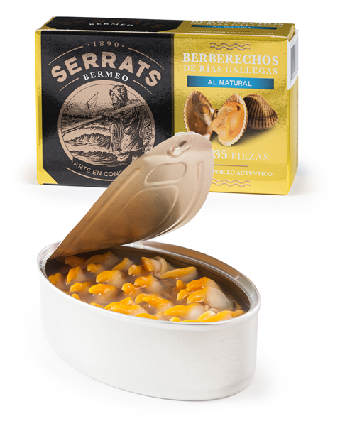 El punto de partida para la elaboración del berberecho en lata consiste en la selección de las mejores materias primas. Conservas Serrats adquiere el berberecho de las Rías Gallegas en el momento óptimo y cuando han alcanzado la talla deseada. Sólo comercializa el berberecho grande (30/35 piezas por lata de 115g).Los berberechos en lata son ideales como aperitivo, para acompañar arroces y hacer riquísimas recetas.Los berberechos al natural son muy sanos, apenas tienen grasa y son ricos en hierro. Puedes abrir la lata de berberechos y disfrutarlos directamente o utilizarlos como ingrediente en las numerosas recetas con berberechos que encontrarás en nuestro blog.