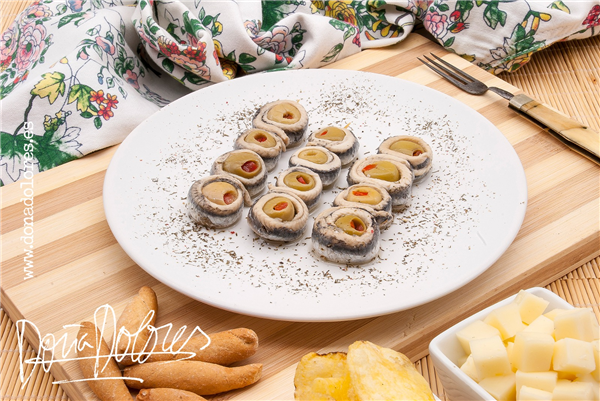 Banderillas de filetes de boquerón del Cantábrico y de aceitunas rellenas de pimiento rojo en aceite