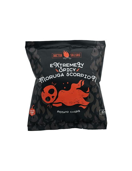 Patatas Fritas de Moruga Scorpion. Las mejores patatas picantes fritas con Moruga Scorpion.La mejor bolsa de patatas fritas con picante del chile Moruga Scorpion Nivel de picante: ExtremoIngredientesPatatas selectas (67%), aceite de girasol alto oléico (28%), chili Moruga Scorpion (4%) y sal marina (1%)