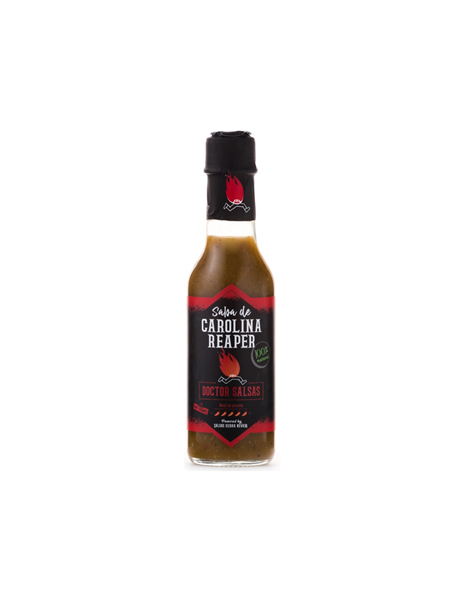 Salsa Picante de Carolina Reaper. Elaborada con uno de los chiles más picantes del mundoElaborada con chile Carolina Reaper, uno de los chiles más picantes del mundo.Nivel de picante de 136.000 SHU en la escala Scoville.IngredientesAgua, chile Jalapeño asado, cebolla, chile Carolina Reaper (8%), ajo, zumo de limón, vinagre de manzana y sal