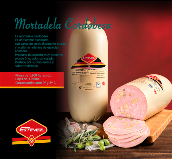 La mortadela cordobesa es un fiambre elaborado con carne de cerdo finamente picada y aceitunas además de especias añadidas.Producto de aspecto muy atractivo, picado fino, color sonrosado. Destaca por su fino aroma y sabor tradicional.