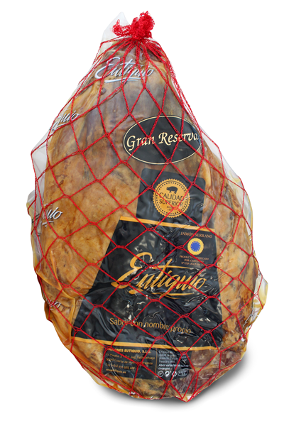 El jamón Serrano Eutiquio es un jamón procedente de hembras y machos castrados de alta calidad. El centro de jamón Serrano Eutiquio tiene un aspecto exterior uniforme y atractivo. Su aspecto al corte es homogéneo en cada uno de sus filetes, mostrando una coloración de la parte magra rojiza y una coloración blanquecina y brillante de su grasa. Su sabor, poco salado y con matices dulces persiste en nuestro. Es, además, un jamón fácil de comer, poco fibroso, con la jugosidad idónea para crear un jamón con nombre propio.
