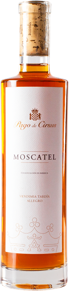 El Moscatel de Pago de Cirsus, hecho a partir de la uva Moscatel de Alejandría, vendimiada de forma manual y tardía en la primera semana de noviembre, es un vino de proceso manual hecho con mucho mimo y cuidado. Su fermentación parcial a baja temperatura en barricas nuevas de roble francés y posterior crianza durante 24 meses en barrica francesa, garantizan un vino dulce excepcional. De apariencia oro saturado, y extraordinaria complejidad en nariz, con notas de frutas tropicales bien maduras, frutas confitadas, orejones y miel. Elegante con gran carácter, intensas notas de bollería e higos. Aromas de azahar, miel de acacia y especias. En boca es de intensidad de múltiples capas, equilibrado y suave. Final largo, con sutiles toques de roble tostado y crema catalana. Ideal para aperitivos con foie gras o platos orientales muy picantes. Buen complemento para la repostería, es su maridaje ideal.