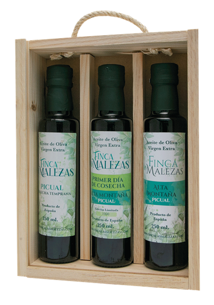Estuche madera 3 bot. Aceite Oliva Virgen Extra de Primer Día, Alta Montaña y Cosecha Temprana 250ml