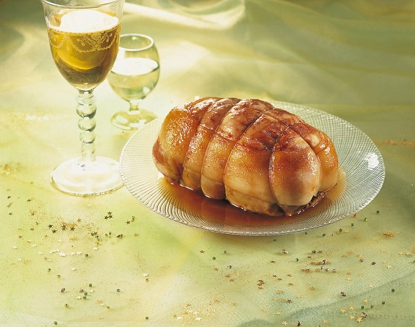 Redondo elaborado a base de carne de pavo con piel, con un relleno de colmenillas, envuelto con una loncha de tocino , atado, congelado. Listo para hornear.