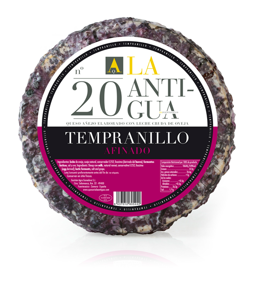 Queso con más de 12 meses de curación, con hollejos de uva tempranillo y corteza natural