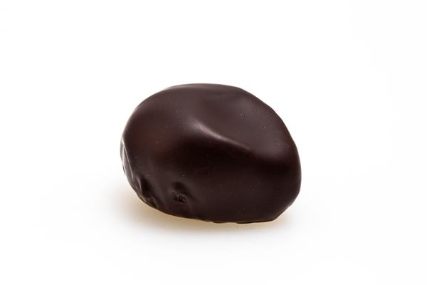 Piezas de Mazapán Calidad Suprema con forma de castaña rellenas de yema y bañadas con cobertura negra de chocolate.