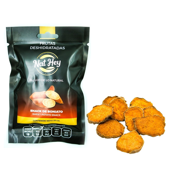 Boniato deshidratado, 100% natural, sin conservantes, aditivos o azúcar añadido (contiene azúcares naturalmente presentes). El boniato es un tubérculo muy apreciado por su dulce sabor y valor nutritivo. Rico en hidratos, proteínas, vitaminas, antioxidantes y minerales esenciales, ayuda a reducir el riesgo de infecciones y aporta energía física y mental. Es ideal para picotear, acompañar cremas de verduras, hummus o diferentes tapas. Apto para veganos y personas intolerantes al gluten, no contiene trazas de otros productos. Nuestro proceso de deshidratación permite conservar todas las propiedades nutricionales de la fruta.