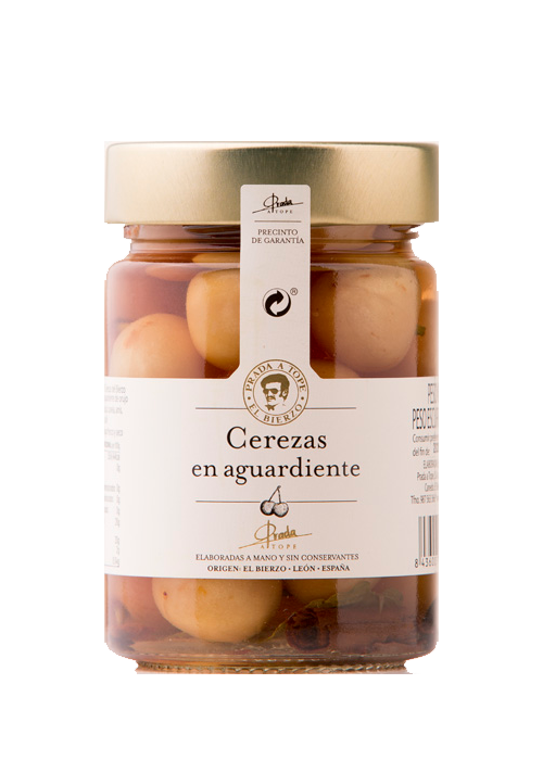 Cerezas del Bierzo envasadas en aguardiente de orujo de uva de 50º, azúcar, canela, hierbabuena, anis y café. Procesadas a mano sin utilizar conservantes ni colorantes. Todos los ingredientes son naturales.