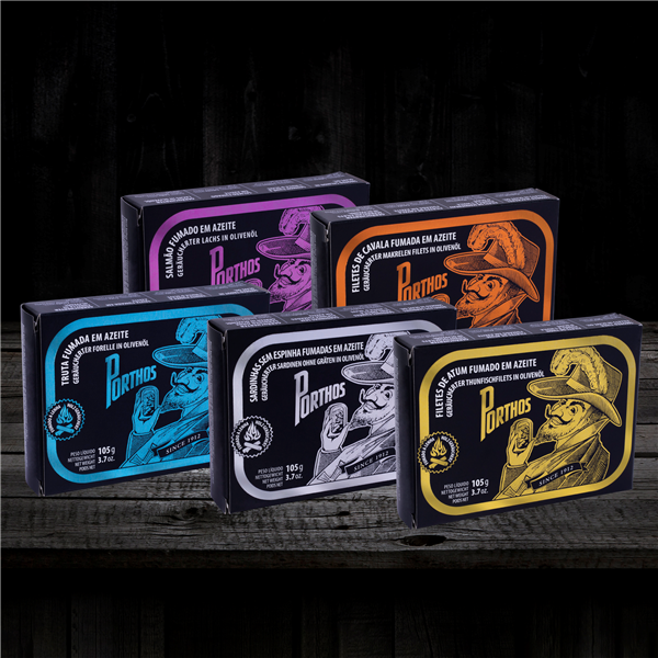 PORTHOS tiene dos líneas diferentes de productos, la Línea Vintage, conservas de sardinas y atún, en diferentes salsas, y la línea de Ahumados, sardina ahumada y atún ahumado, y además trucha, salmón o caballa, ahumados.