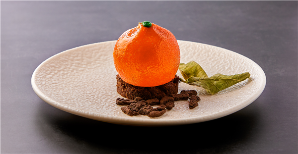 Cheesecake de mandarina montado con interior de mermelada de mandarina confitada con base estrésel de almendras y cacao.
