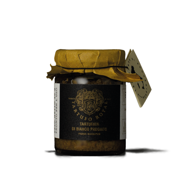 Un producto enteramente artesanal y 100% Hecho en Italia, la trufada de Bianco Pregiato recoge en sí todo el sabor único e inconfundible de la Trufa Blanca (Tuber Magnatum Pico), recolectada en los territorios entre Molise y Abruzzo.