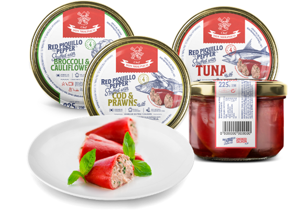 Pimientos rellenos premium en aceite en formato cristal 260 gramos y lata 860 gramos.