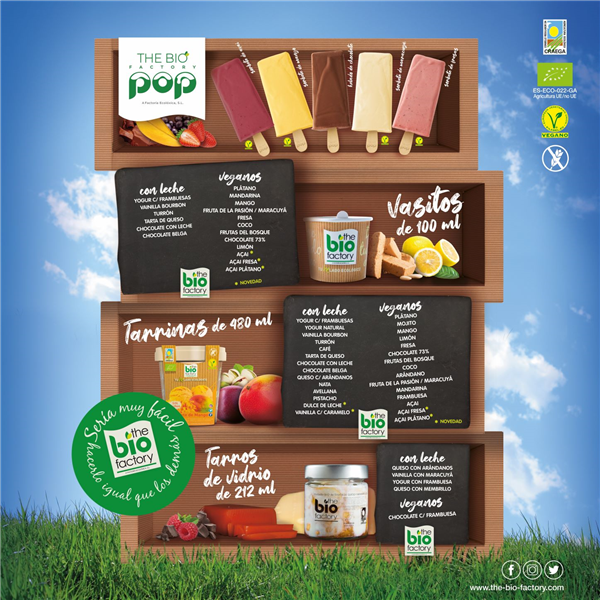 THE BIO FACTORY es el primer y único fabricante de helados de producción ecológica de Galicia con una experiencia de mas de 10 años. Elaboramos diariamente helados artesanos veganos y de "toda la vida" certificados por el CRAEGA y por V-LABEL, todos ellos sin gluten, sin huevo, sin mantequilla y sin pastas del alto contenido graso de origen vegetal, tales como coco, almendra, avellanas, palma, entre otras.