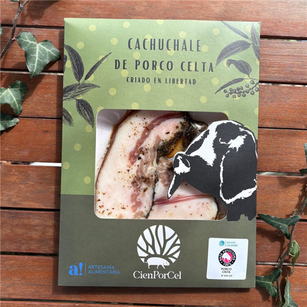 Cachuchale, la versión gallega del Guanciale italiano. Papada de cerdo celta curada y adobada con una selección de especias. Sin conservantes ni colorantes y elaborada de manera artesanal una a una. Sin gluten ni lactosa.