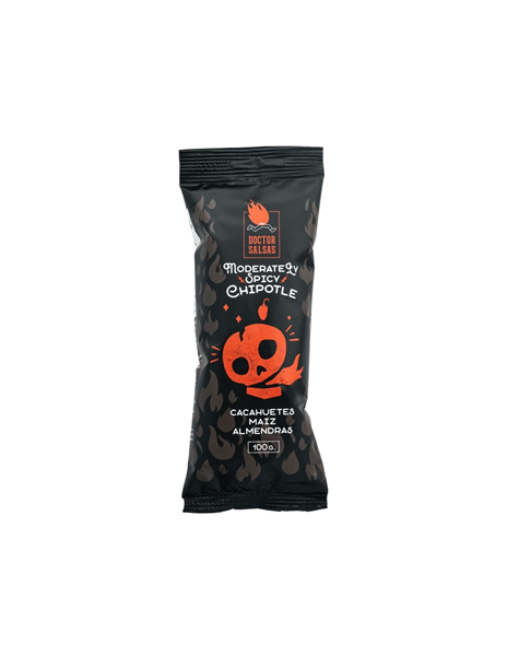 Bolsa de Snacks Mix Picantes (Kikos, Almendras y cacahuetes)Nivel de picante: Moderado¡Revolucionarios del Picante ¡Esto ya es la bomba! Cuidado porque cuando pruebes este Pack Mix estarás acordándote de nuestro “Doctor Salsas” durante horas.Cacahuetes de chipotle, kikos de Chipotle, y almendras garrapiñadas con Chipotle. Una mezcla con toque picante, súper sabrosa y un poco adictiva.Estos frutos secos con chile Chipotle son la combinación ideal para disfrutar de un aperitivo, cuando los pruebes te aseguramos que no podrás parar de comerlos.¡Son increíbles! Un toque de picante, un punto dulce y el sabor ahumado del Chipotle provocan una sensación increíble en tu boca. Hemos creado este mix de frutos secos para que puedas disfrutar de los mejores frutos secos en la misma bolsa ¿Se te hace la boca agua como a nosotros? Puedes comprar una bolsa en nuestra tienda online.Su toque ligero de picante combina muy bien con un aperitivo, cuando los pruebas notas además su ligero toque de sal, dulzor y sabor ahumado del Chipotle.¿Se te hace la boca agua como a nosotros? Puedes comprarlas en nuestra tienda online.IngredientesKikos, Almendras y cacahuetes