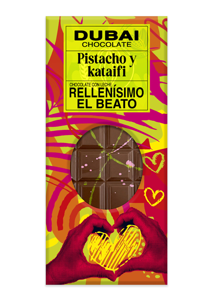 SUMÉRGETE EN EL LUJO DE DUBÁI CON NUESTRO CHOCOLATE CON LECHE RELLENÍSIMO DE PISTACHO. CADA MORDISCO ES UN VIAJE SENSORIAL: UNA EXPLOSIÓN DE PASTA DE PISTACHO, TAN ABUNDANTE QUE SE DESBORDA, SE COMBINA CON EL CRUJIENTE DELEITE DE LOS GRANILLOS DE PISTACHO Y LA DELICADA TEXTURA DE LA PASTA KATAIFI.