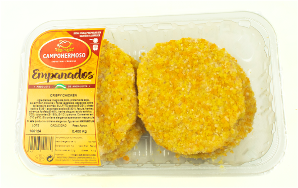 Burger elaborada de pollo, bajo en grasa, no contiene pan ni gluten ,empanada con fibras vegetales.