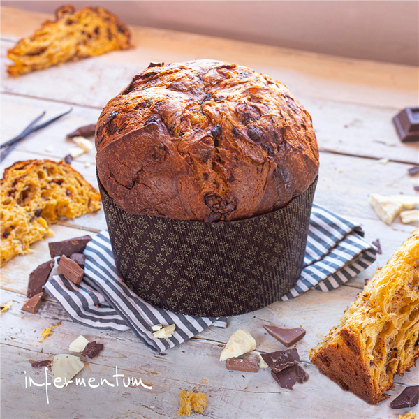 Un panettone relleno de virutas de chocolate con leche, blanco y negro al 61%.