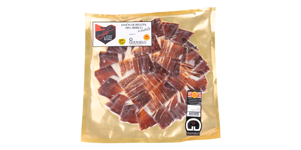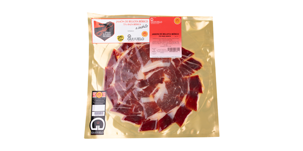 Jamón de Bellota 75% Raza Ibérica DOP Guijuelo, cortado a cuchillo, emplatado y envasado al vacío