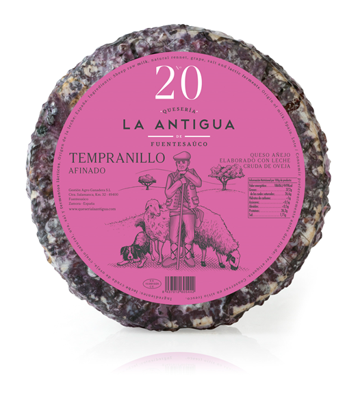 Queso con más de 12 meses de curación, con hollejos de uva tempranillo y corteza natural