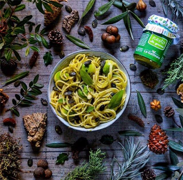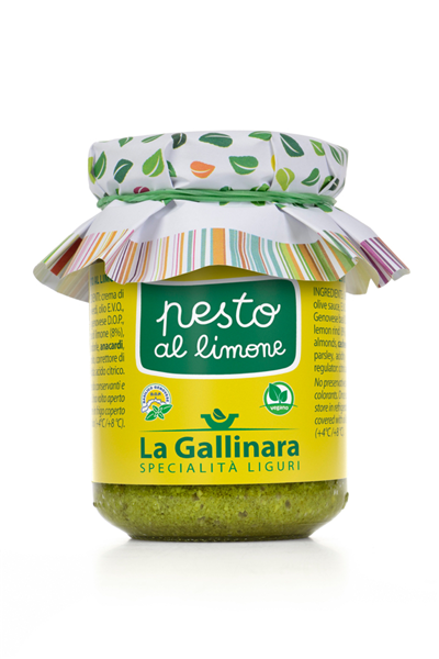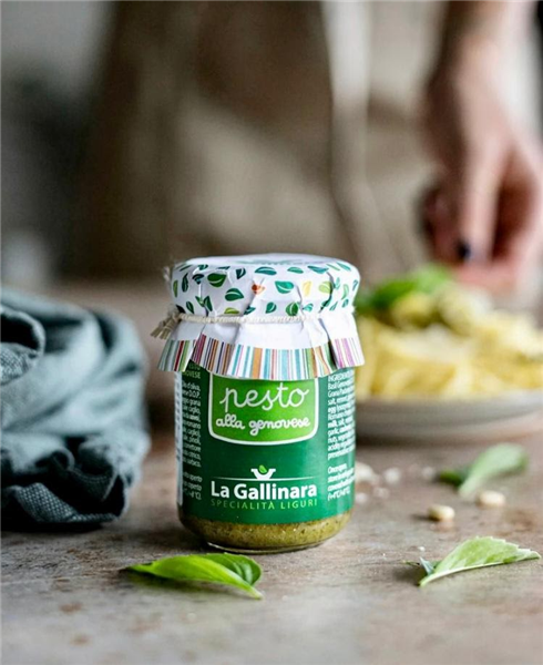pesto genovese, ingredientes: basílico DOP, aceite de oliva 100% italiano y grana padano.