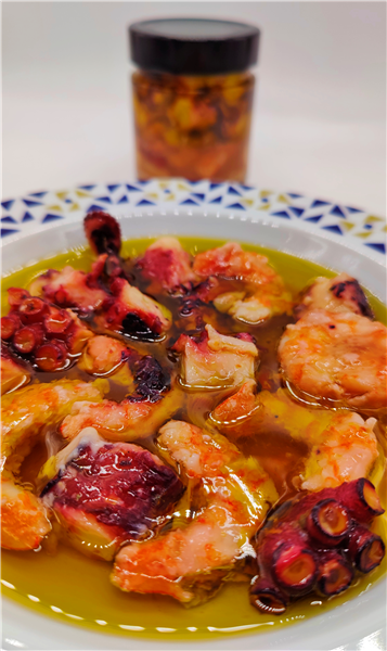 Pulpo gallego con gambones en aceite de oliva virgen extra con ajo y guindilla
