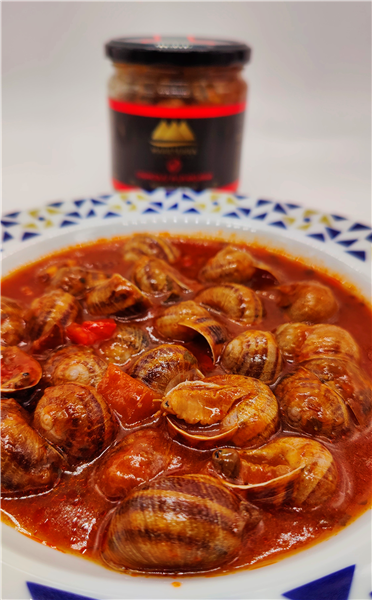 Caracoles elaborados en una salsa a la riojana acompañada con taquitos de bacon y jamon