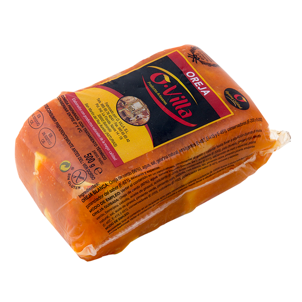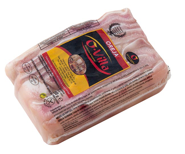 Oreja de cerdo, gelatina natural, conservantes y especias.