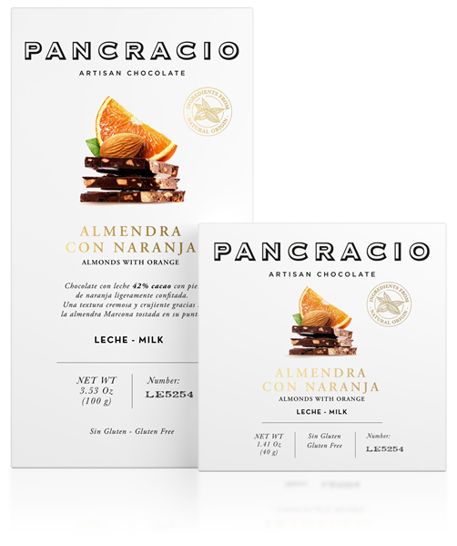 Chocolate con leche 42% cacao con almendras y piel de naranja ligeramente confitada