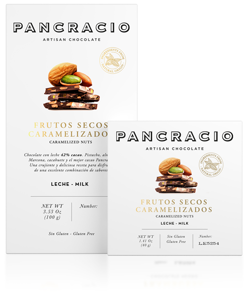 Chocolate con leche 42% cacao. Pistacho, almendra Marcona, cacahuete y el mejor cacao Pancracio