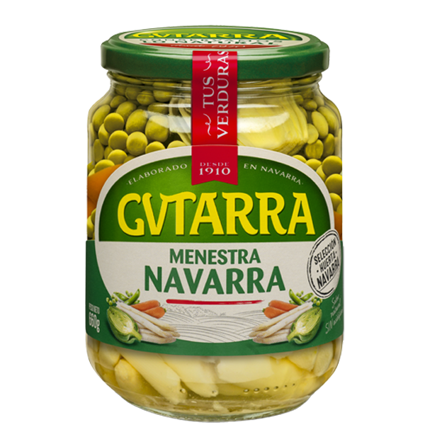 La Menestra Navarra de Gvtarra es una combinación única de las mejores verduras de la huerta de la Ribera Navarra. Con alcachofas, espárragos, zanahoria y guisantes recolectados y envasados ??en su temporada, ofrece una textura suave y un sabor natural. Gvtarra sigue los más estrictos controles de calidad para garantizar una mezcla perfecta sin acidificar. Ideal para la temporada de invierno.
