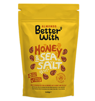 Dulce miel y sal marina en almendras crujientes y sabrosas.