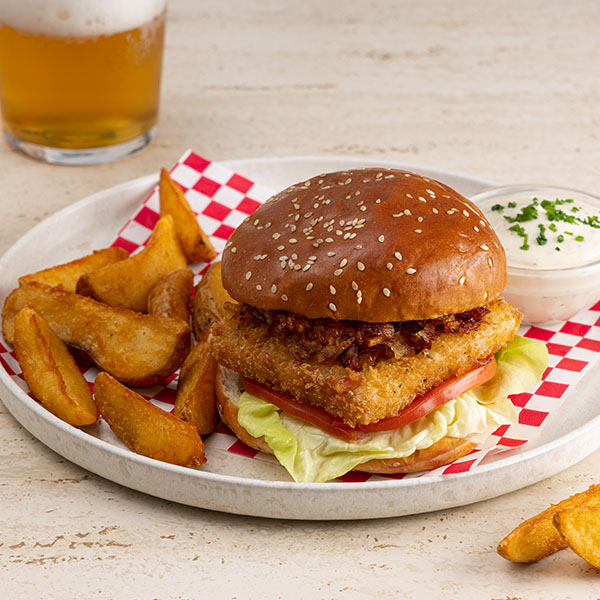 Crunchy fish burger. Tasty portion of haddock, with a crispy crispy breading and unique juiciness.